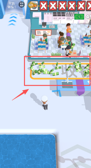 3、点收银区红箭头,数45元现金,收桌上的绿色钞票,服务排队顾客。