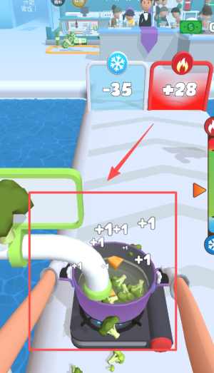 2、盯红箭头下的西兰花,让绿色管道送更多菜进锅,看温度和满意度数值变化。
