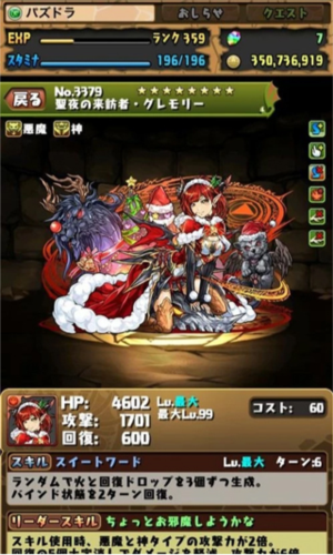 究进后的赫拉拥有超高三围,以及游戏初期强力的技能“重力”。队长技能:“神王妃的气息”是使恶魔型宠物攻击力提升3.5倍,即使有着血线的限制依然是强力无比的存在.