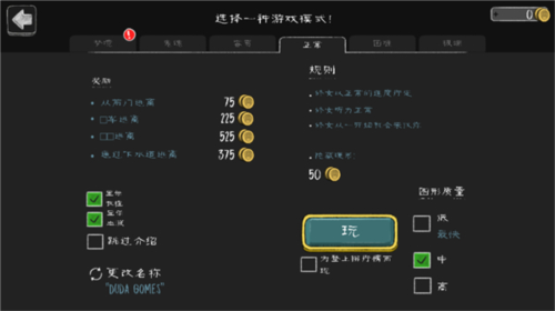 1、当我们的玩家打开游戏后点击开始,会看到在屏幕的左下角有难度的选择,这里如果你不更改的话系统会自动选择正常模式。不过我建议大家前期玩的时候还是选择简单练练手比较好,因为简单模式我亲测的也是非常难的。在屏幕的右下角名字那里如果你打勾的话需要在上边纸张上给玩家取名,如果不打勾系统随机取名。全部设置好后点击继续就可以进入游戏了。