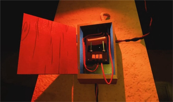 屋子内有个铁栏门无法打开,旁边有个发动机,但是去发动机的门在漏电