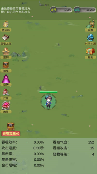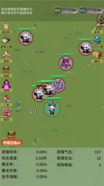 割草:游戏的所呈现给玩家的割草玩法可以说是相当的草率了,部分割草游戏是省略了攻击键位,但是这款游戏直接不让玩家干涉,移动键位也是直接抛除了,玩家在这款游戏中只能干巴巴地看着角色与敌人碰撞,吞噬,纯放置体验,压根不需要玩家干涉,的确是极致休闲了,蛮适合一些摆烂型玩家体验,但是也的确是没什么可玩性,太无聊了些。