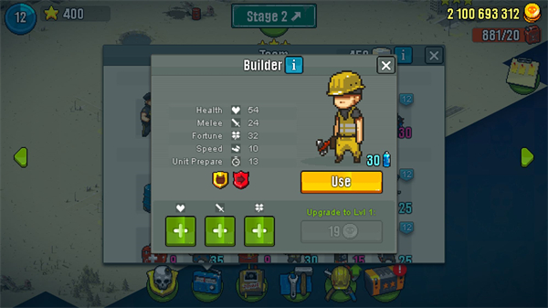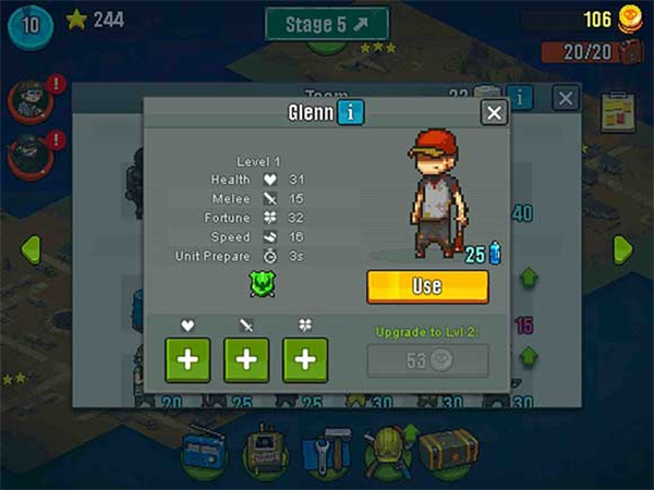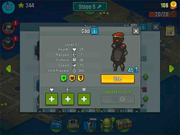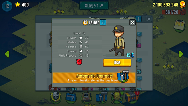 卡车的升级只需要金币,但是士兵的升级更为复杂一些,血量、攻击力和幸运值的升级需要各自获得相应的补给才能升级。