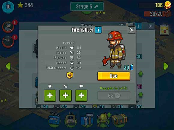2、前期对于消防员和建筑工没必要投资,可以将小红帽和工兵提升一下,女牛仔要出,单体45+的攻击力很有用。