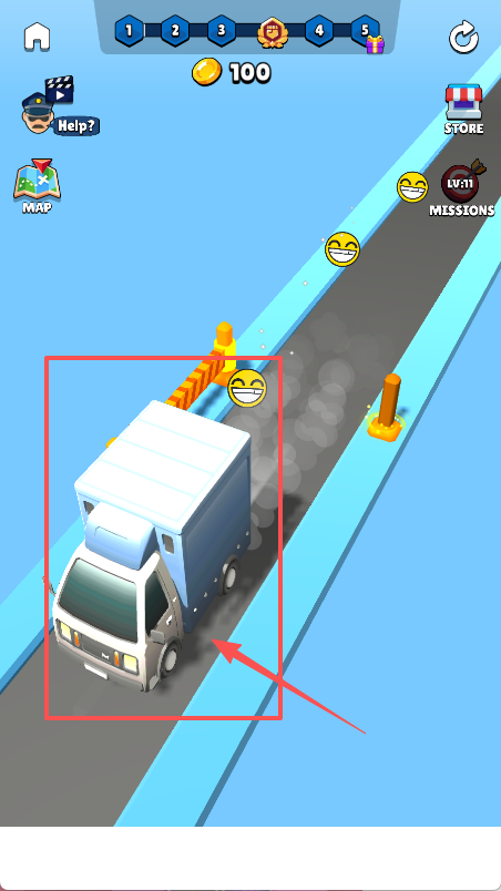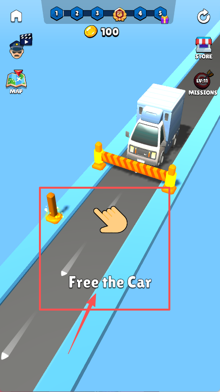 1、看游戏主界面,点下方手形图标解救被路障挡住的货车,注意看关卡和金币信息。