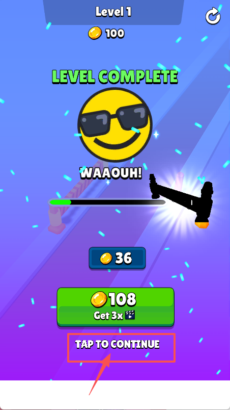 3、关卡完成后点绿色按钮继续,领取3倍金币奖励,进度条显示过关评价。
