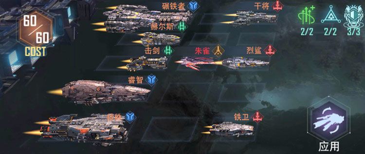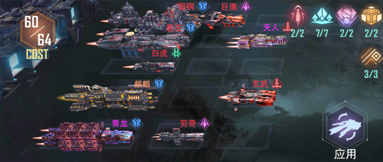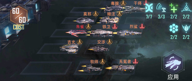 该阵容中星舰以攻击敌方全体为主要攻击方式,搭配核心战术联结【第七军团】通过战术联结的技能伤害加成,对敌方全体目标造成致命打击。同时【不灭舰队】大增强了前排战列舰生存能力,【战地主宰】和【狩猎时刻】提升了后排星舰输出可谓战无不胜。在军事建筑【舰队核心枢纽】解锁前,可将巨像和穷奇替换为毒腺、交涉护卫舰组合,在COST值上限提升后可继续上阵1艘巡洋舰增加输出能力