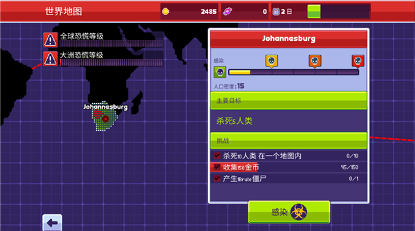 传染恐慌3启示录中文手机版是一款生存游戏,游戏以实验室病毒泄漏引发的丧尸危机为背景,玩家需扮演反派指挥官,通过投放病毒、组建僵尸军团实现全球感染,最终摧毁人类文明,你需要通过拼合DNA解锁35种特殊能力僵尸(如吸血鬼、金将军),并升级病毒属性以增强感染效率。