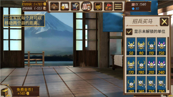 幕府帝国,一款以幕府时代日本为题材的战棋策略游戏,游戏中玩家将扮演一位军阀,通过自己的战术策略和发展布局来壮大自己的部队,从大大小小的军阀中脱颖而出,统一全日本。游戏非常考验玩家的策略能力,需要时刻注意周遭家族势力的敌对或盟友关系,不断发展经济,升级灵气,组建无敌的部队。