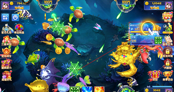 游戏中经常会出现闪电鱼、黑洞鱼、冰冻鱼、炸弹鱼等特殊鱼种。每种特殊鱼被捕获均会造成对应的特殊效果,对屏幕中其他鱼种造成影响。