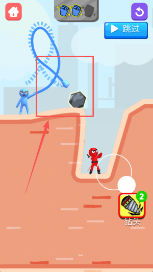 4、当需要对付远处的敌人时,可以点击右下角黄色的钻头道具,然后用蓝色绳索套住岩石砸向对方。