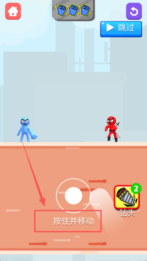1、看到两个小人后,按住底部那个白色圆圈拖动,调整蓝色小人出拳方向,让拳头打中右边的红色小人。