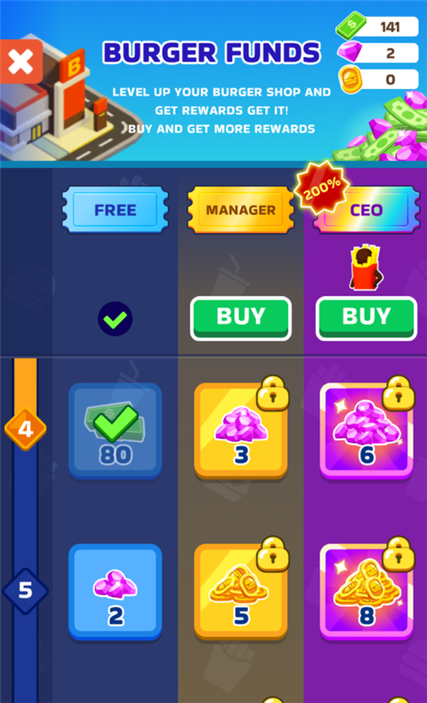 3、玩家可以免广告获得奖励,不断的解锁更多区域的经营特色,更多的配方可以为玩家吸引更多的客流量,休闲益智的游戏挑战游玩,包含了更多趣味的玩法模式,扩大自己汉堡店的经营收益,喜欢的玩家快来试试吧!