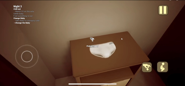3、接下来是换尿布,最关键的时刻到了,胆小的人做好心理准备,你拿到尿布刚要给他换的时候会突然变成恶魔把你吓倒,然后开始召唤玩具攻击你,你必须赶紧来到你自己的房间,拿出金色奶嘴给他戴上,那时候他就会突然倒下,你就得带着他去婴儿房,给他读绘本,然后第1个故事结局达成了