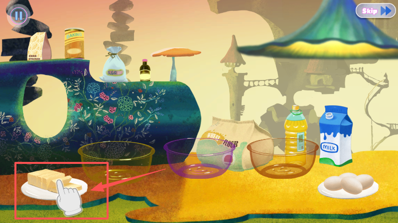 4、点击台面黄油,备好鸡蛋牛奶做蛋糕的材料。