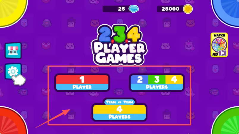 1、点红色1PLAYER单人游戏,或点蓝绿234PLAYERS多人游戏,还能点黄蓝组队对战。