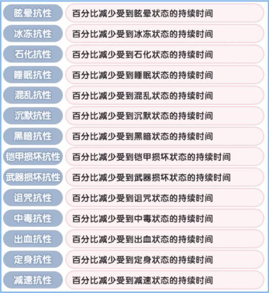 提升对于特定属性或者技能抗性的词条,减少受到对应debuff效果影响的时间。