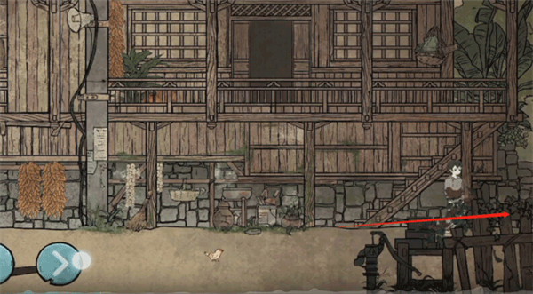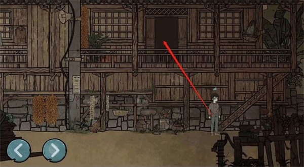 5、从室内的木梯走向2楼,来到第3个房间的门口,在竹篮子里得到【符号环】