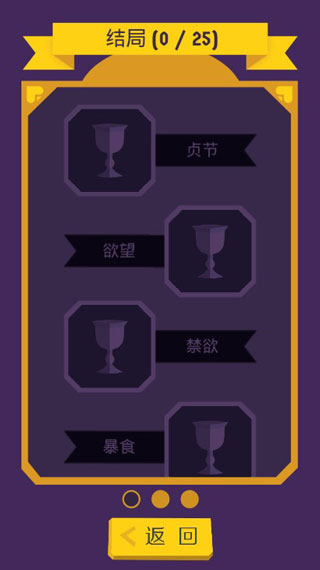 游戏结局多样,达到一定的条件即可解锁以下结局,分别为:贞节、欲望、禁欲、暴食、慷慨、贪婪、勤奋、懒惰、耐心、愤怒、仁慈、嫉妒、前辈、骄傲、贫困、谋杀、自杀、营养不良、家庭、执行、解雇和叛变等等。