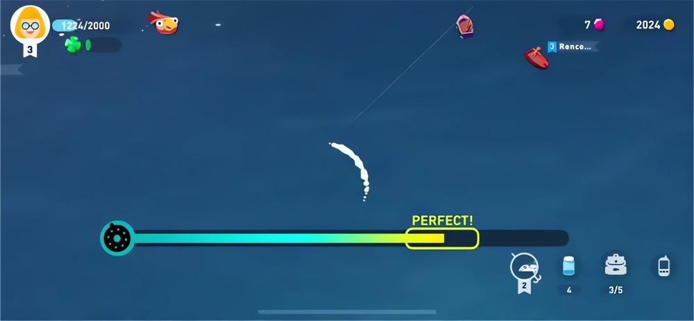 捕捉稀有鱼类颇具挑战性,因为你永远无法预知何时能钓到它们——直到它们咬钩那一刻。钓普通鱼时,只需轻点屏幕一次,渔夫便会自动作业。但面对稀有鱼类,你需要更积极地参与:屏幕下方会突然出现一条进度条。你的目标是让进度条与小方框保持重叠状态,直至鱼获抵达船边。