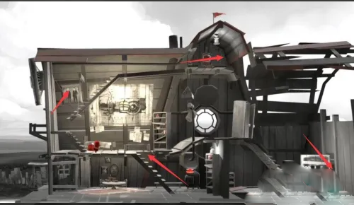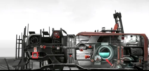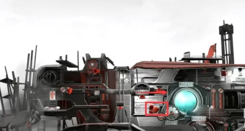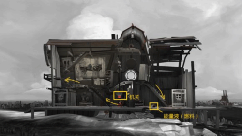 图中高亮的是机关,橙红色,所有图中都是这种颜色机关,由于人只能控制前后和跳跃动作,所以按钮基本就是顶,踩,推 这几种。能量液用于驱动后面的 房车(帆车)。能量液不直接叫燃料,因为它后面可以用来灭火,叫燃料有点违和。