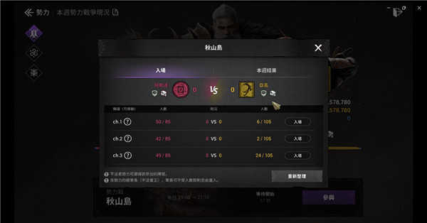 势力战每天9点会正式开打,对战时间只有10分钟,会分多个频道做为场次。玩家可以选择其中一个场次入场,中间也能进行切换,但有较长的冷却时间,推荐就在选好的场次开打就好,前期可以考虑先选我方人多的场次,频道人数上限为190人。本週势力战争结束后也会发放BUFF,连输也还有获得,本週势力战争会将各势力全员的总势力分数和势力战胜利分数一起计算,不法者贡献分数则是额外计算,之后依最后势力阶级和胜败发放奖励。