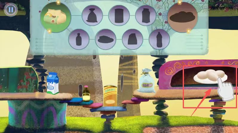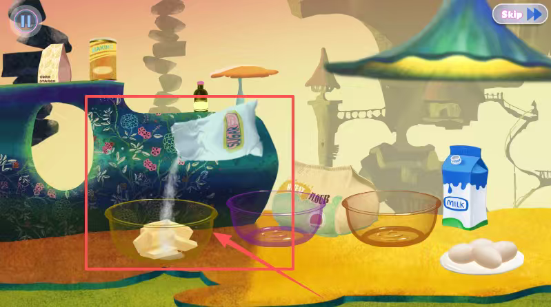3、鼠标点红框面粉袋,从岩石平台拿烘焙材料,准备做蛋糕原料。