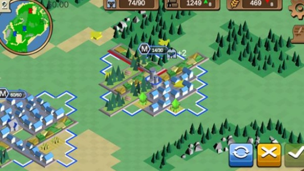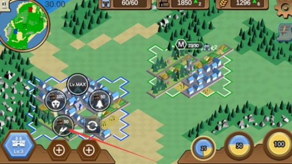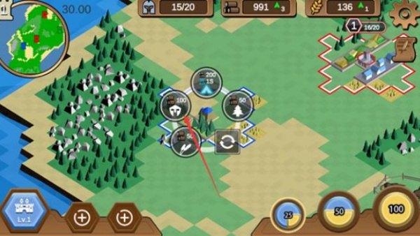你可以可建造伐木场、农田、兵营,获得木材、粮食、士兵数,木材用于建造升级,粮食用于产出士兵,兵营用于训练士兵,所以这就需要玩家在这三种建筑和资源中相互权衡,以此达到最优的策略方针。