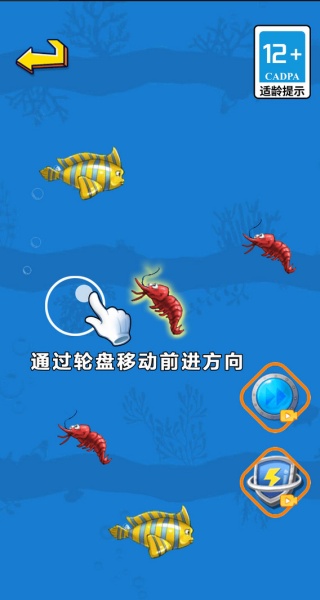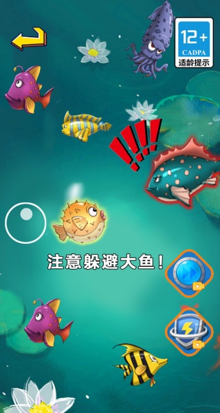 1、进入游戏后,你可以利用轮盘操控着自己的小鱼移动和前进。