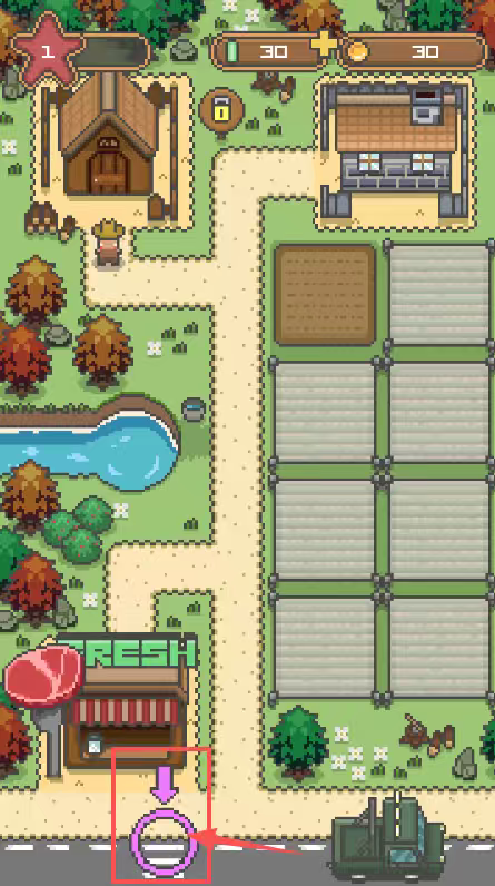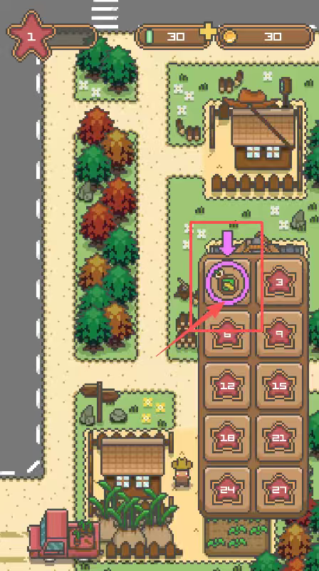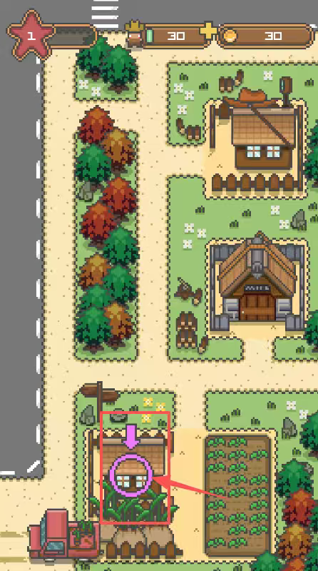 2、瞄红框木屋,点紫圈跟箭头,攒30资源点升级农场建筑,注意左下商店。