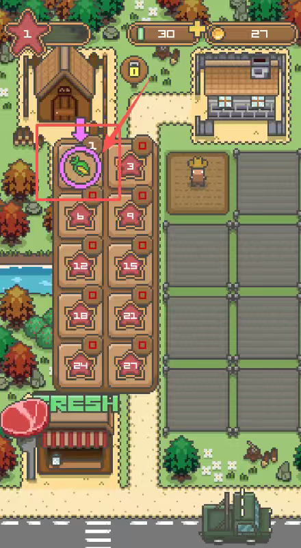 4、盯1号红方块种子,派草帽人物去田里,攒金币买种子,左下FRESH店换物资。