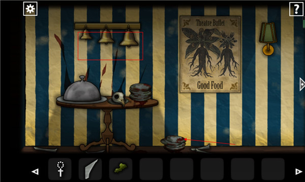 5、在上面这个铃铛根据213112循序点击,之后下面的餐盘就可以打开了,在里面可以获得一个眼球。