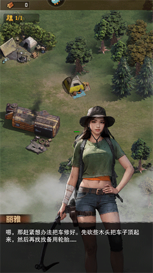 5、来到希望镇,点击地图上的树木可以砍树,点击废弃的建筑可以修复,点击垃圾可以探索...