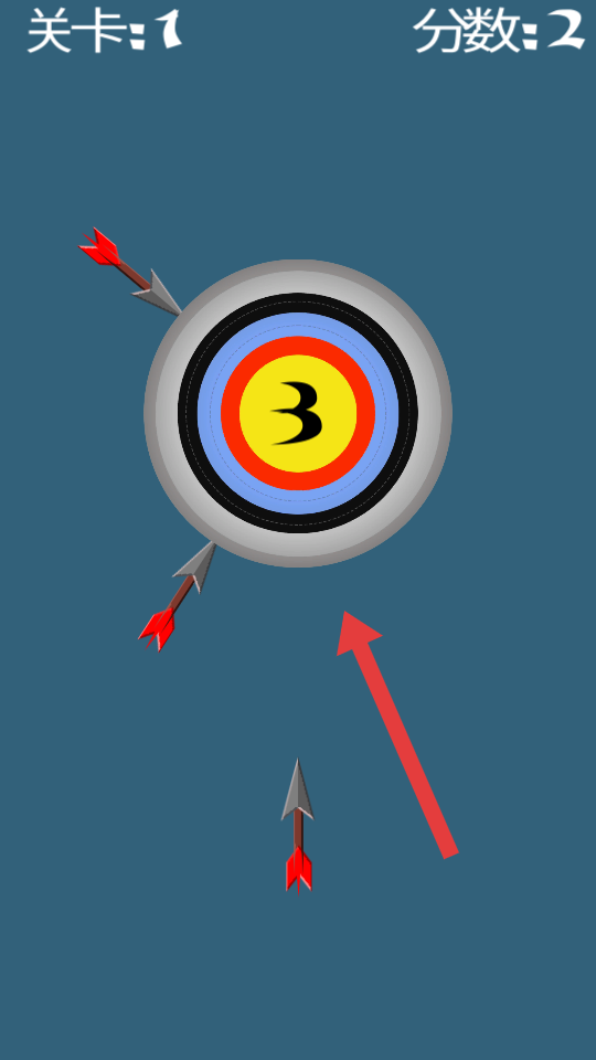 2、在第一关,瞄准带有数字的靶心射箭,射中靶心可获得分数,界面会显示关卡数和当前分数,逐步积累分数。