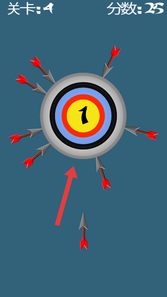 4、随着关卡推进,到第四关时,靶心周围已有多支箭,需精准瞄准靶心射箭,不断积累分数,挑战更高关卡。