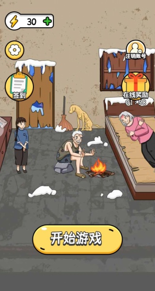 1、进入游戏后,你会看到奶奶、爷爷和孙女都冷得瑟瑟发抖,点击“开始游戏”进入游戏界面。