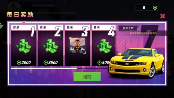 1、拥有每日登录奖励可以领取,连续登录七天可以获取豪华汽车奖励哦!