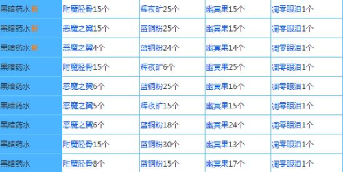 1、黑暗药水:附魔胫骨15个、辉夜矿25个、幽冥果15个、凋零眼泪1个
