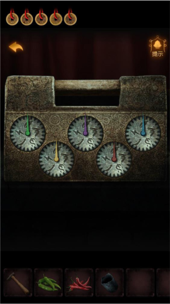 9、进入院子,查看窗台上的箱子,对照信纸上的线索,将指针调整到对应位置,打开箱子获得【锯子】【打火机】。