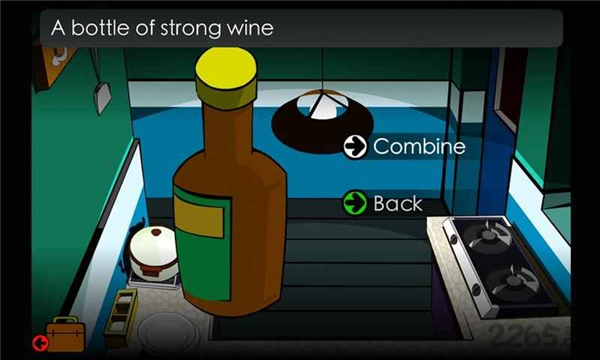 9、点击拿出一块肉,再会到进入厨房的位置再往左侧走,在左下角拿一个酒瓶和一个盘子。点击盘子,放大;点击肉,再点击放大的盘子,得到肉盘子;点击酒瓶,再点击肉盘子,得到“一盘子浸过烈酒的肉”。