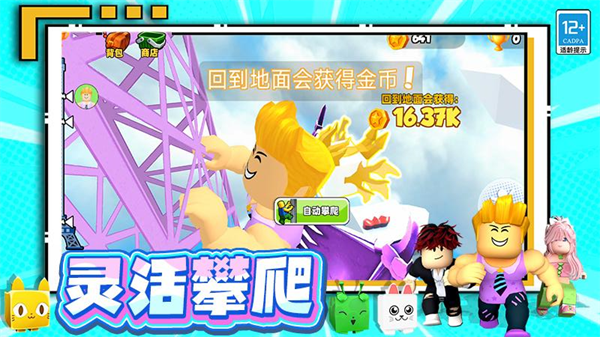 1、3D卡通画面风格鲜明,搭配动态光影效果与真实物理反馈,营造出极具沉浸感的攀塔视觉体验。