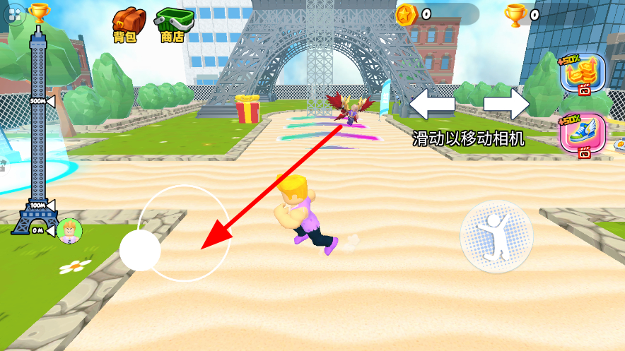 1、通过左侧的移动操控区域,控制角色在场景内移动,朝着目标方向前进,探索不同的区域,开启游戏体验的第一步。