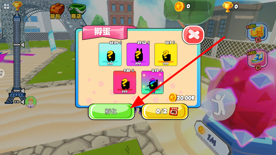 3、当遇到神秘蛋时,进入孵蛋界面,展示不同的蛋以及孵化相关选项,点击孵化按钮,获取孵化后的物品或角色。