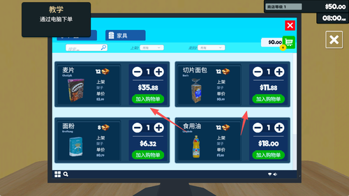 1、进入游戏后跟随新手教程完成基础操作学习,掌握货架布置、商品上架与收银流程的具体执行方式。