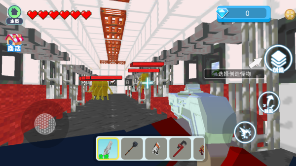 1、进入游戏,第一人称视角开始冒险,射击不同的怪物,可以自由的更换不同的武器。