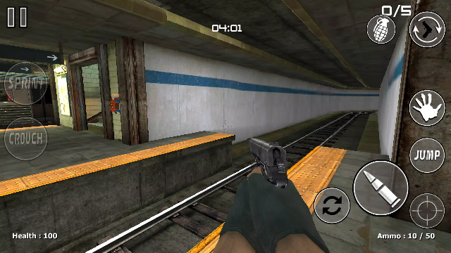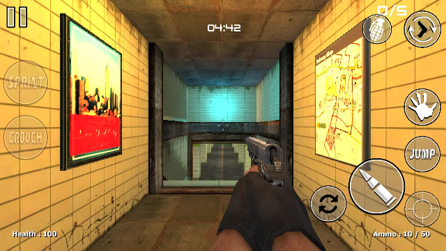 通过左侧的“SPRINT”(奔跑)、“CROUCH”(蹲伏)按键调整移动状态,右侧的射击、换弹、跳跃等按键进行战斗操作,注意屏幕显示的血量(Health)和弹药量(Ammo),确保战斗时状态充足。