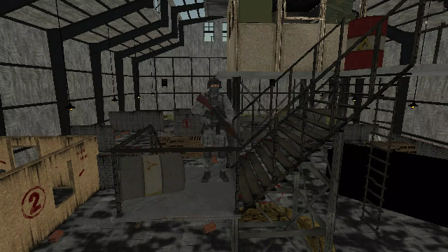 进入游戏后,先观察所处的战场地形,利用仓库内的楼梯、油桶等掩体,规划移动和射击路线,了解敌人可能出现的位置。