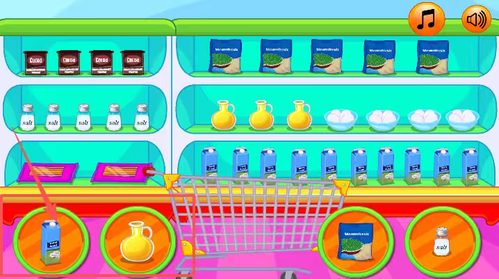 3、在虚拟超市场景里,用购物车从货架四层拿饮品、油、食品、调料等烹饪所需物品。