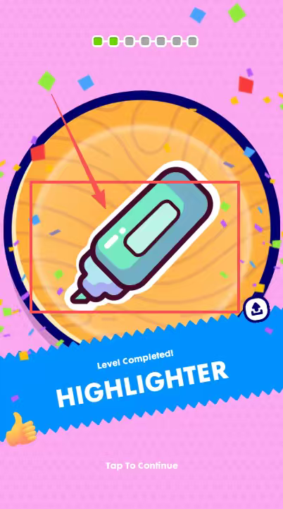 2、看到橙色圈里蓝绿荧光笔,点下方Tap To Continue进入下一关。
