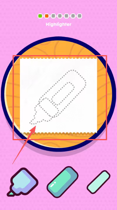 1、在粉色背景画板区域,用荧光笔轮廓内工具绘画填充,下方三图标是操作工具。